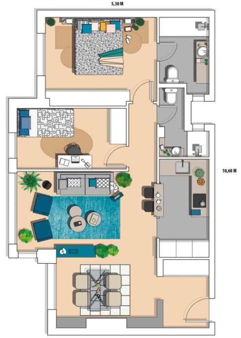 Từ cửa chính, không gian được bài trí lần lượt là bàn ăn - nhà bếp được nằm cạnh nhau và đối diện là phòng khách. Nhà sử dụng kiến trúc hiện đại với không gian mở rộng xóa đi sự gò bó từ các bức tường làm nên một sự hoàn thiện một cách rõ nét. Hành lang dẫn vào với 2 phòng ngủ và nằm gần kề là 2 nhà vệ sinh phục vụ cho nhu cầu sinh hoạt một cách thuận tiện nhất.