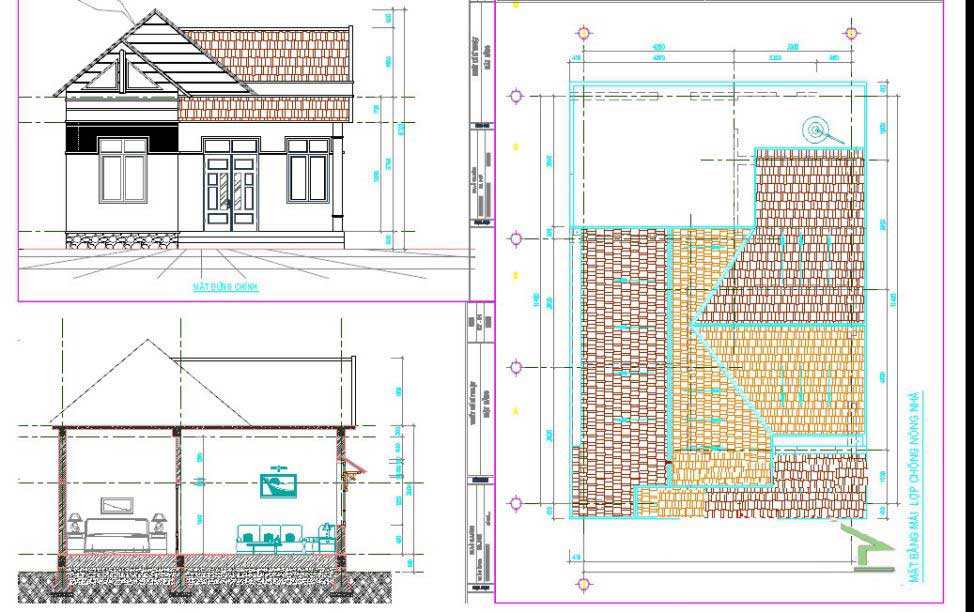 * Bản vẽ mặt trước + mặt cắt và bản vẽ mái: