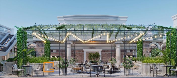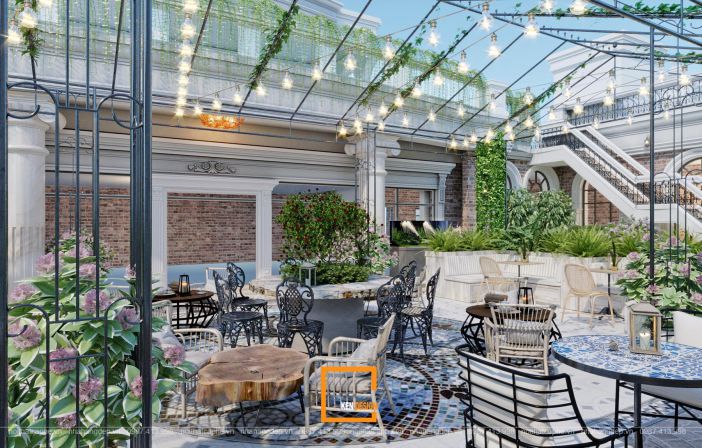 Với không gian rộng thì bạn nên tham khảo mẫu thiết kế quán cafe tân cổ điển sân vườn trên đây. Với màu sắc tươi sáng, các chi tiết nội thất, ngoại thất đều được thiết kế tỉ mỉ và tinh tế. Ngoài ra, hệ thống bóng đèn LED và những cây cảnh góp phần làm tăng thêm vẻ sang trọng, yêu kiều cho không gian quán. Bên cạnh đó, việc tập trung tạo điểm nhấn cho quán bằng những giàn hoa, hiên gỗ, tượng thạch cao… đã mang đến không gian tựa như vườn treo Babylon trong thần thoại Hy Lạp.