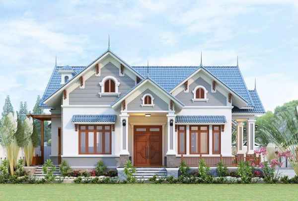 Ngoài ra, mẫu biệt thự 1 tầng 4 phòng ngủ cũng rất thích hợp cho những gia chủ muốn tìm kiếm một ngôi nhà mới, trẻ trung nhưng không kém phần sang trọng và lịch lãm cho ngôi nhà mơ ước của mình. Ấn tượng là hệ thống mái thái màu xanh than mang đến cảm giác ấm cúng và sang trọng phù hợp với sở thích cũng như mệnh của gia chủ. Phần mái được thiết kế theo dạng xòe chữ A tạo dáng cao cân đối chiều cao và chiều rộng của ngôi nhà, tạo lớp đệm không khí không hấp thụ nhiệt từ mái tôn lên làm mát mùa hè và ấm áp cho mùa đông.