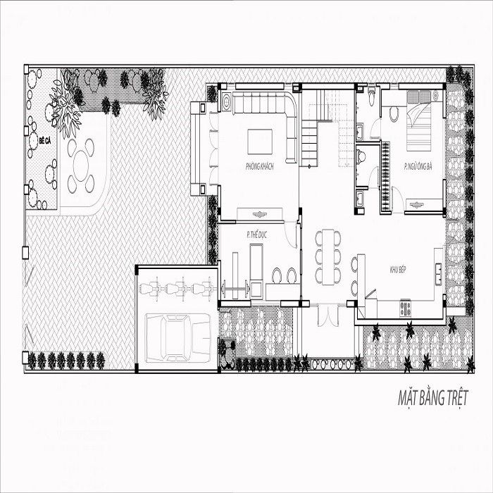 Bên cạnh việc cụ thể bằng những hình ảnh 3D, mặt bằng tổng thể nội thất của căn biệt thự 10x12m thì chúng tôi còn giới thiệu đến các chủ đầu tư chi tiết bản vẽ của mặt bằng tầng trệt căn biệt thự 10x12m. Với tầng trệt bạn hoàn toàn có thể thiết kế với khu vực gara ô tô ở bên ngoài. Khu vực bên trong của ngôi nhà khuôn viên đầu tiên qua sảnh là phòng khách, qua phòng khách là đến phòng ngủ của ông bà, bên cạnh đó còn là khu bếp với cả phòng bếp và phòng ăn, ngoài ra tại tầng trệt còn được thiết kế với một phòng để các thành viên đến với những môn thể thao rèn luyện sức khỏe.
