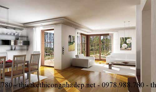 Màu trắng nhẹ nhàng và thanh thoát được sử dụng làm tone màu chủ đạo của phòng ăn và phòng khách. Để điểm tô cho không gian, màu tường sẽ kết hợp với màu cánh dán sáng của nền nhà. Phòng ăn được thiết kế khá đơn giản song vẫn rất bắt mắt, là địa điểm ấm áp, nơi cả gia đình cùng đoàn viên, sum họp.