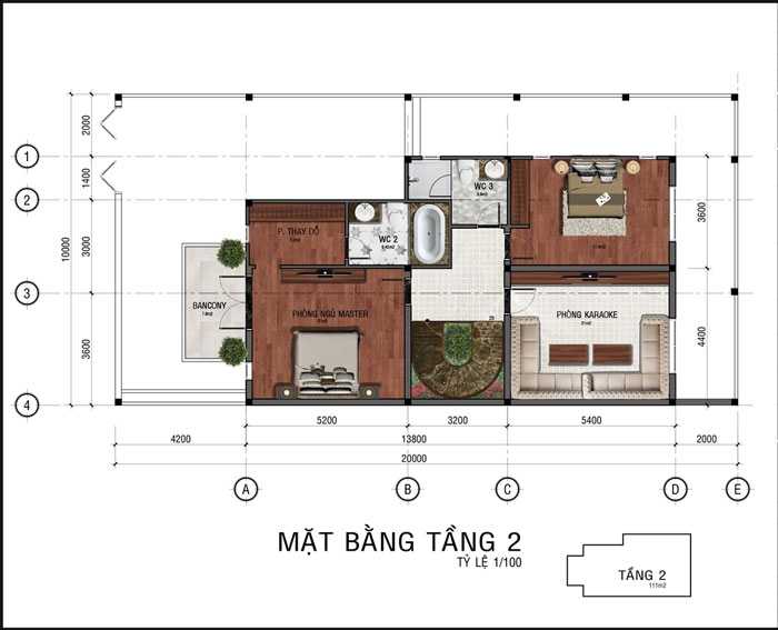 Mặt bằng tầng 2 trong mẫu biệt thự 4 tầng 100m2 bao gồm: 2 phòng ngủ, 1 nhà vệ sinh, 1 phòng karaoke. Trong 2 phòng ngủ sẽ có 1 phòng được thiết kế thành phòng ngủ mastẻ với nhà vệ sinh bên trong, khu vực thay đồ rộng rãi và 1 chiếc ban công rộng lớn để từ vị trí ban công này thành viên sở hữu sẽ đón nhận ánh sáng mặt trời khởi động cho một ngày mới.
