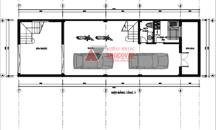 Mặt bằng tầng 1 của mẫu biệt thự 4 tầng 90m2 được sử dụng làm gara ô tô, xe máy cho gia chủ. Không gian này còn được bố trí nhà vệ sinh nhỏ để thuận tiện cho chính bản thân gia chủ sử dụng. Với gara này, kiến trúc sư bố trí cửa sau đi ra sảnh phụ phía sau nhà giúp phần nào đó thông thoáng khí, lấy ánh sáng. Kiến trúc sư không sử dụng hết phần diện tích mà chửa ra một sân trước để trẻ nhỏ trong nhà có không gian vui đùa. Sử dụng 2 cầu thang trong cùng 1 không gian: 1 cầu thang đặt ở ví trí trước nhà dẫn lên tầng 2 nơi vị trí phòng khách của gia chủ dành cho vị khách đến chơi nhà, và 1 cầu thang đặt trong gara ô tô để bản thân gia chủ sau khi đậu đỗ xe trong nhà có thể di chuyển trực tiếp lên tầng 2 dễ dàng.