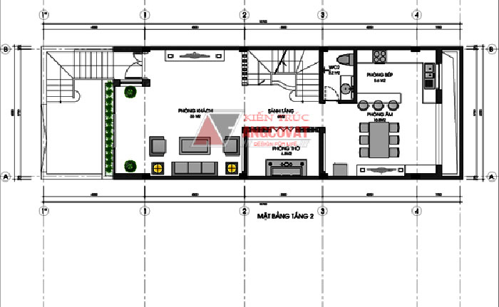 Mặt bằng tầng 2 của mẫu biệt thự 4 tầng 90m2 bao gồm không gian: Phòng khách, phòng thờ, khu vực bàn ăn cùng với không gian bếp, nhà vệ sinh.