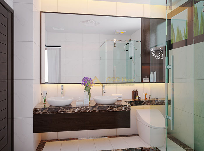 Nhà vệ sinh với không gian nhỏ nhưng được bố đầy đủ tiện nghi với 1 bên là khu vực phòng tấm được quây bằng hệ thống kính cường lực và một bên vệ sinh với lavabor đôi cùng bồn câu. Toàn bộ nhà vệ sinh được ốp kinh để dễ dàng lau chùi.