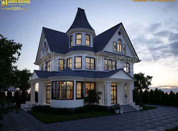 Mẫu biệt thự lâu đài phong cách Châu Âu cổ điển được xây dựng trên khu đất rộng 300 m2. Ngôi biệt thự rất độc đáo với sự kết hợp điển hình giữa vẻ đẹp mềm mại, mê hoặc của Châu Âu và kiến trúc lâu đài. Mái ngói xanh của biệt thự kết hợp với màu sơn nâu đặc trưng đã mang đến cho chủ đầu tư một thiết kế ấn tượng. Kiến trúc biệt thự được trang trí tỉ mỉ và công phu với tiền sảnh sử dụng hệ thống cột trụ tròn, toát lên vẻ đẹp lộng lẫy, quý phái. Các bức phù điêu được thiết kế tỉ mỉ, đặt ở vị trí cao hơn so với mặt ngõ ban công.