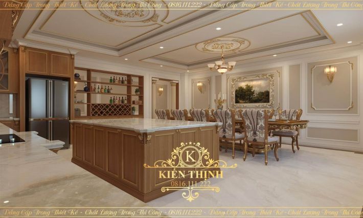 Nhà bếp và phòng ăn cũng được bố trí, thiết kế sang trọng nhưng vẫn mang đậm chất cổ điển châu Âu nhưng lại có những biến tấu cho phù hợp với văn hóa của người Việt. Ngoài màu vàng là chủ đạo, không gian phòng ăn còn được tô điểm thêm bởi những họa tiết hoa lá trên bọc ghế ăn. Nó giống như một nét chấm phá, mang đến vẻ độc đáo cho không gian này.