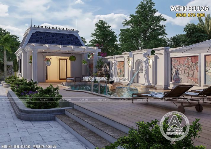 Căn biệt thự sân vườn 1 tầng cổ điển này được xây dựng trên khu đất có diện tích rộng cho nên bên cạnh việc chú ý đến kết câu và trang trí ngoại thất thì cả chủ đầu tư và nhà thiết kế đều chú trọng đến không gian sân vườn để mang cuộc sống trở nên gần gũi với thiên nhiên hơn và là nơi thư giãn của cả gia đình..