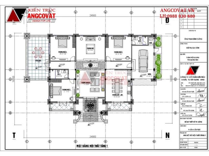 Với căn biệt thự 1 tầng này sẽ bao gồm các phòng chức năng như sau: Phòng khách, 3 phòng ngủ, phòng thờ, phòng bếp + nhà ăn, 2 nhà vệ sinh, gara, phòng giạt và phơi đồ.