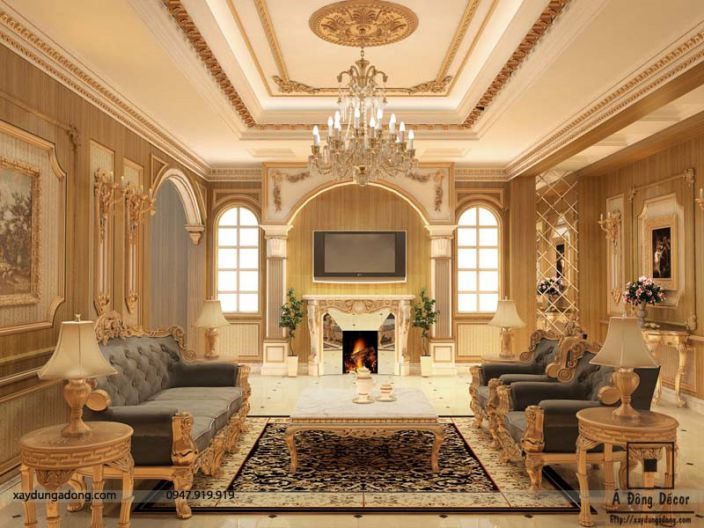 Phòng khách sẽ được bố trí với diện tích rộng nhất, đảm bảo nhu cầu tiếp khách cũng như việc tụ họp gia đình. Không gian phòng khách có sự thống nhất giữa màu của hệ của chính, màu sơn tường và bộ sofa. Với phong cách cổ điển, không gian phòng khách không thể thiếu đi chiếc đèn chùm tỏa ra ánh sáng ấm áp. Ngày nay, nhiều gia đình sẽ lựa chọn đèn quạt trần thay cho đèn chùm truyền thống để trang trí.