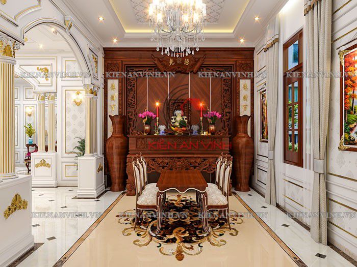 Phòng thờ đặt được đặt trang trọng, ở giữa công trình và sử dụng những ón đồ nội thất sang trọng. Nó là nơi để thể hiện lòng thành kính, sự biết ơn của con cháu với tổ tiên và các bậc tiền nhân.