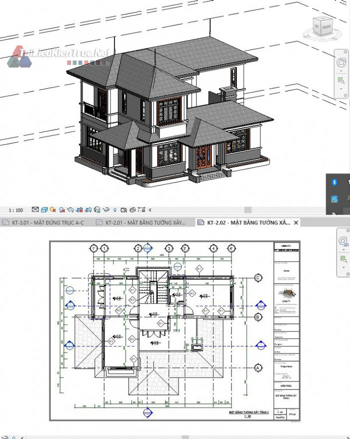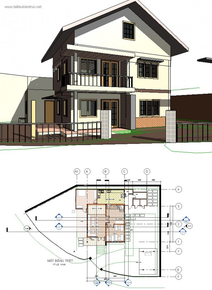 Phối cảnh bản vẽ cùng mặt bằng tổng thể nội thất biệt thự 2 tầng đẹp.