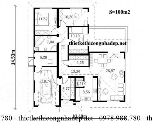 Bố cục của biệt thự mini 100m2 được bố trí với phòng khách và khu vực ăn uống trong không gian, thiên về diện tích rộng và thoải mái. Tiếp theo, bếp sẽ được bố trí ở vị trí kín đáo, thuận tiện cho gia chủ. Phần khác dành riêng cho các thành viên tư nhân với 3 phòng ngủ dùng chung nhà vệ sinh cho cả tầng.