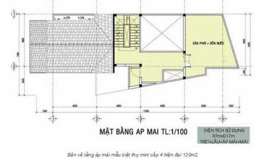Tầng áp mái được bố trí khoảng thông tầng chính giữa, nhằm giúp lấy ánh sáng cho toàn không gian luôn sáng sủa. Mẫu biệt thự có thiết kế 1 bồn nước sinh hoạt cho cả gia đình và có lối cầu thang nhỏ lên tầng mái.