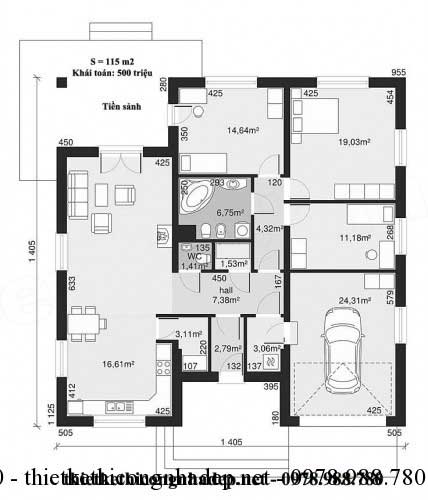 Mô hình biệt thự đẹp được xây dựng trên diện tích vừa phải, trong đó tổng diện tích là 115m2, mỗi bên của ngôi nhà là 14m chia làm 3 phòng ngủ, 1 khu vực để xe, bao gồm phòng khách và bếp như những công trình bình thường. Mái nhà sẽ được thiết kế lợp hoặc tiết kiệm chi phí bằng cách thay thế bằng tôn giáo sai. Cấu trúc của mái nhà được thiết kế với một phần của mái bằng trải ra xung quanh 4 để làm mái nước cho mái ngói với hệ thống khung thép mạ kẽm. chống gỉ. Chi tiết này sẽ góp phần tiết kiệm chi phí xây dựng cho chủ nhà kết hợp với việc giảm tải cho nền móng.