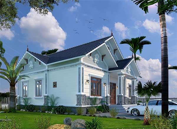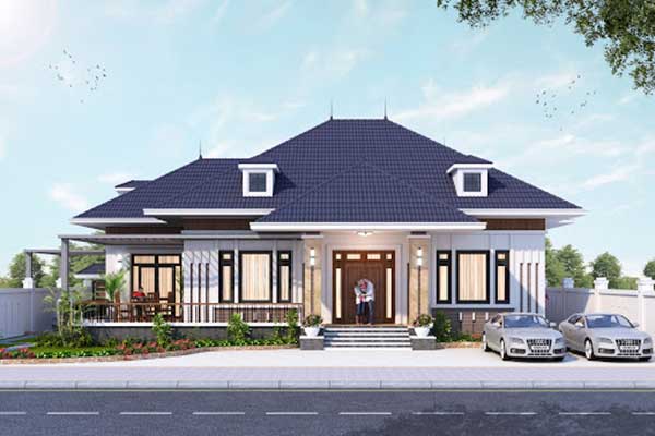 Hướng tới một cuộc sống hiện đại và tiện nghi, mẫu biệt thự sân vườn 1 tầng này hoàn toàn là ý tưởng dành cho bạn. Ngôi nhà được thiết kế theo kiến trúc tân cổ điển kết hợp với kiến trúc mái ngói của người Việt mang đến một ngôi nhà đẹp và thu hút. Cửa gỗ làm tăng thêm vẻ đẹp hiện đại và sang trọng cho không gian. Khoảng sân rộng rãi trước nhà có thể được sử dụng để đỗ ô tô hoặc để các thành viên trong gia đình chơi đùa.