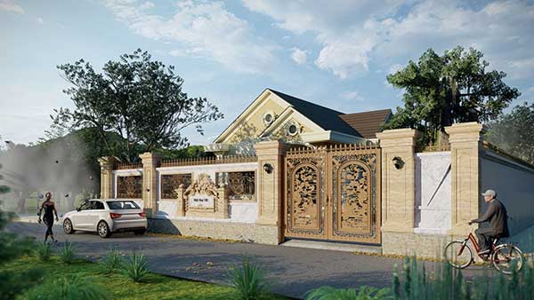 Phong cách cổ điển, hoàng gia, quý tộc được thể hiện rõ nét qua mẫu biệt thự sân vườn 1 tầng này chỉ qua thiết kế ngoại thất của ngôi nhà. Tường bao quanh được thiết kế với những họa tiết cầu kỳ, chi tiết, hệ cửa sơn vàng càng làm nổi bật lên giá trị của ngôi nhà. Việc thiết kế tường bao này sẽ đảm bảo cho an ninh ngôi nhà tốt hơn.