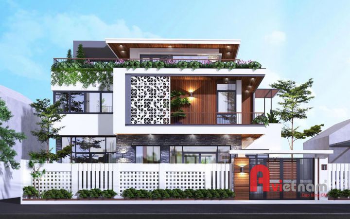 Đây là một thiết kế biệt thự tân cổ điển mái bằng nên khoảng không phía trên sẽ là một sân thượng siêu rộng. Bạn có thể dùng thang để di chuyển lên sân thượng thư giãn hay có thể trồng rau xanh cho cuộc sống gia đình. Từ hình khối khỏe khoắn của mẫu biệt thự trên cho chúng ta thấy vẻ đẹp trong kiến trúc xây dựng và thiết kế độc đáo của nghành kiến trúc. Hàng dào và cổng biệt thự đều được thiết kế và trang trí với tông màu trắng mang đến sự thanh lịch cho căn biệt thự tân cổ điển này.