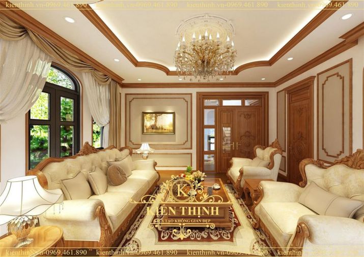 Với mẫu nội thất trên bạn nhìn thấy ngay các họa tiết hoa văn mang đậm màu sắc phương Tây, và những chiếc đèn chùm lộng lẫy lung linh tạo sự trang trọng nguy nga đang đứng giữa biệt thự tiền bạc tỷ của bạn. Không gian phòng khách được huy hoàng hơn nhờ tông màu tươi sáng của mẫu nội thất này.Sự kết hợp màu sắc có khoa học và hiện đại mang đến dáng vẻ tân cổ điển tuyệt đẹp. Sự khéo léo kết hợp bộ sofa vải cao cấp để tạo nên độ thẩm mỹ. Ngoài ra hình ảnh về mẫu nội thất còn cho chúng ta thấy những bức trang tân cổ điển tuyệt đẹp được treo trên tường làm tăng lên giá trị của ngôi biệt thự