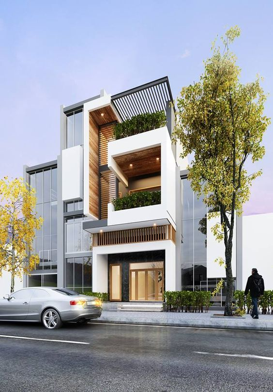 Với thiết kế hiện đại, không cầu kì, xa hoa nhưng vẫn đem lại hơi thở, sức sống cho căn nhà đơn giản, tinh tế. Điểm nhấn chính của mẫu mặt tiền này được tập trung vào hệ thống cửa, lan can với kính cường lực cùng với gam màu trắng tinh tế, đơn giản chủ đạo tạo vẻ hiện đại, khỏe khoắn cho ngôi nhà. Bên cạnh đó lam gỗ ban công còn được trang trí thêm những chậu cây xanh tươi mát mang lại bầu không khí trong lành và ánh sáng tự nhiên tốt hơn. Thiết kế mở bởi những rào chắn hở, mang đến không gian không bị bí bách, ngột ngạt.