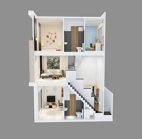Mẫu thiết kế trên đây là một mẫu nhà ống, mái bằng cụ thể. Chúng ta thấy những phòng chức năng được sắp xếp mang tính hợp lý cao. Khi tầng 1 là không gian dành cho sinh hoạt chung, lầu 2 là không gian riêng tư dành cho phòng ngủ. Thì phần gác lửng của ngôi nhà được thiết kế với một bộ bàn ghế sô pha trắng, nổi bật những chiếc gối nhỏ màu đen. Đây chính là không gian lí tưởng để bạn và gia đình có thể tận hưởng những giây phút thư giãn bên nhau sau cả ngày vất vả, mệt mỏi.