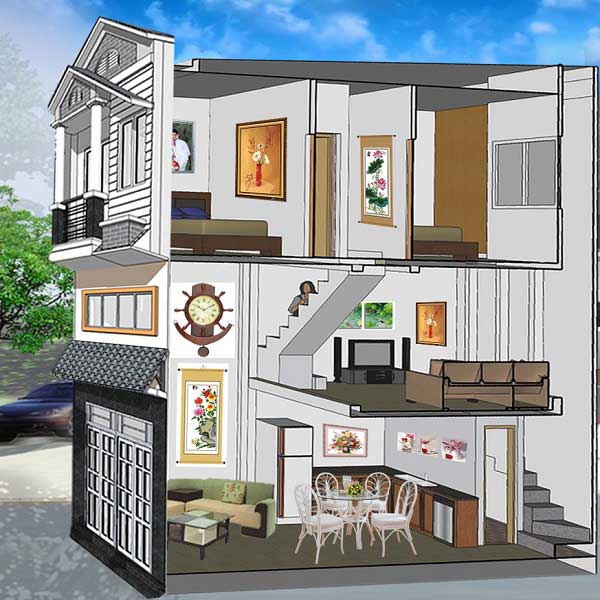 Được thiết kế với 1 trệt 1 lầu. Không gian mái hình chóp. Ngôi nhà có diện tích bề ngang hẹp này chúng ta thấy rất phổ biến ở khu vực thành phố. Nhưng chúng ta thấy rằng với cách sắp xếp hợp lý thì không gian của ngôi nhà vẫn không hề chị chật trội. Khi các phòng chức năng được đáp ứng đầy đủ với cách sắp xếp thiết kế thông minh. Chắc chắn rằng bạn và cả gia đình sẽ có một cuộc sống thoải mái nhất.