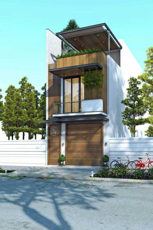 Với thiết kế hiện đại, ngôi nhà khoác lên mình vẻ đẹp sang trọng. Tường ốp giả gỗ nổi bật lên trên nền màu trắng, mục đích của viếc ốp đá giả gỗ là muốn ngôi nhà tăng tính thẩm mĩ, đồng thời khiến tường nhà sạch hơn. Cách thiết kế phần ban công tầng 2 khá độc đáo, 1 bên lõm sâu vào, tạo cảm giác thị giác, bên ngoài tận dụng trồng cây xanh, tăng không gian và giúp hài hòa căn nhà. Trên tầng 3 có bài trí lam gỗ giúp cân chỉnh ngôi nhà và thuận tiện cho việc trồng các loại cây leo.