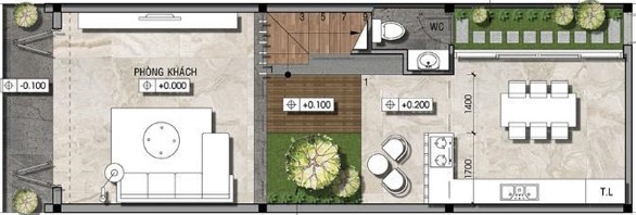 Kết cấu tầng 1 : Từ phía mặt tiền đi vào là chức năng từ phòng khách, 2 khoảng sân vườn nhỏ bên trong ngôi nhà, 1 nhà bếp kết hợp theo một bàn ăn nằm ngay phía chính diện và không thể thiếu 1 nhà vệ sinh cho mặt bằng thêm hoàn thiện.