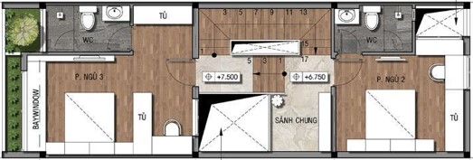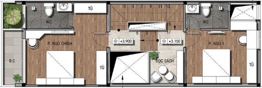 Mặt bằng tầng 3 : Vẫn là các chức năng từ 2 phòng ngủ để cách thành viên có thể lựa chọn cho không gian nghỉ ngơi cửa mình khi bên trong có đầy đủ các tiện ích cho việc sinh hoạt. Từ chính diện hướng cầu thang là một sảnh lớn nơi có các gian phòng chức năng kèm theo.
