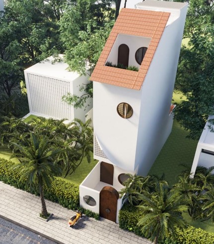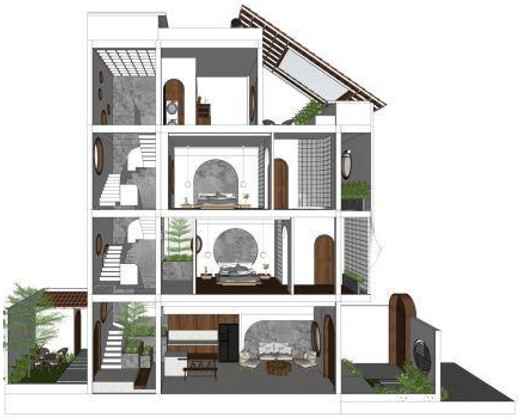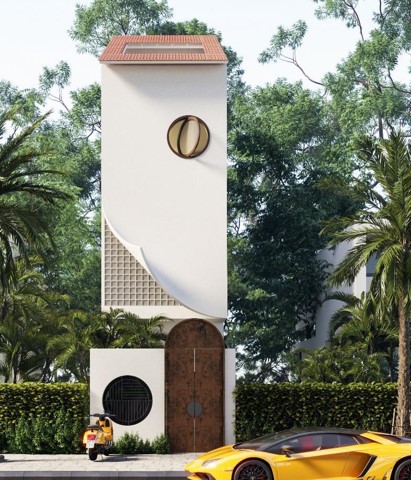 Trở lại với công trình nhà phố 1 trệt 3 lầu, chúng ta có thể thấy cảnh quan như được chan hòa với kiến trúc để làm nên một nét tổng quan hết sức bắt mắt từ cây xanh, khu vườn, các kiến trúc liền kề như càng làm tôn lên cho nét đẹp của chúng thêm trọn vẹn hơn. Các hình tròn được đặt ở vị trí cổng và mặt bằng tầng như thể hiện theo một cách mới lạ tạo nên sự đồng bộ cho công trình thêm giá trị hơn lạ mắt hơn rất nhiều.