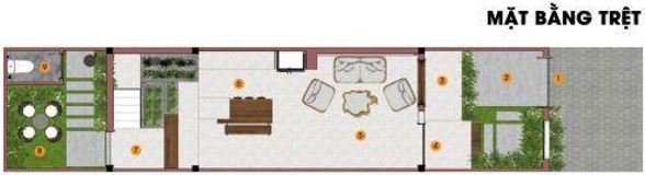 Mặt bằng tầng trệt : Thông qua bản vẽ, mọi người có thể thấy được các chức năng được hiện hữu từ phần sân trước, phòng khách, sân vườn phía sau ngôi nhà kèm thêm là khoảng sân được tích hợp ngay phía bên trong của chúng để trả lại một không gian xanh tươi thông thoáng.