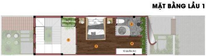 Mặt bằng tầng 1 : Gồm các chức năng chính từ : không gian thư giãn, kèm 1 phòng ngủ với diện tích 15m, nhà vệ sinh nằm trong phòng ngủ với 6m2, và không gian thay đồ các chức năng như được cơi nới cho phần diện tích từ chức năng đã được lược bỏ chỉ để sử dụng với 1 phòng ngủ.