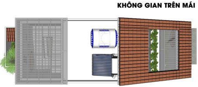 Không gian mái : Nơi bạn có thể tích hợp các vật dụng, vật liệu hỗ trợ cho việc sinh hoạt của gia đình mình. Mà thông qua bản vẽ, các chức năng gồm có với 1 bồn chứa nước, 1 mái nhà lợp ngói truyền thống, 1 mái lấy sáng với chức năng như một phần giếng trời để lan tỏa nguồn năng lượng mặt trời cho mọi kết cấu bên trong ngôi nhà.