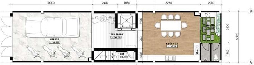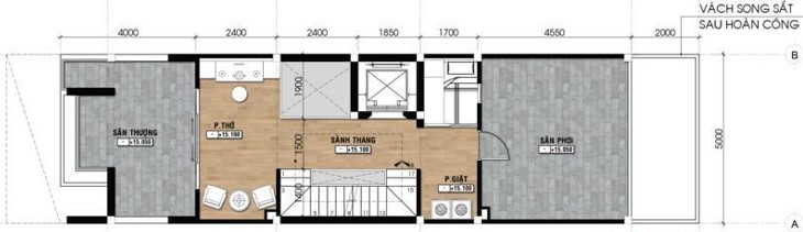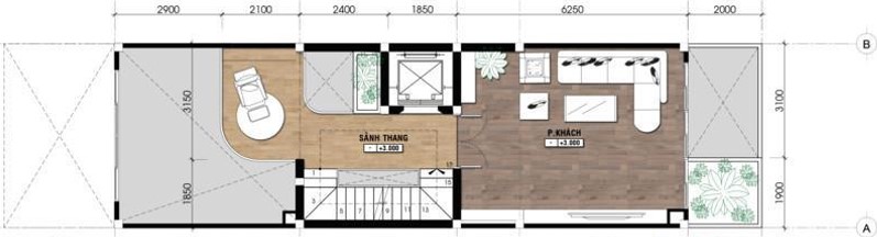 B. Nội thất từ bản vẽ của ngôi nhà dạng ống 1 trệt 3 lầu có gác lửng :