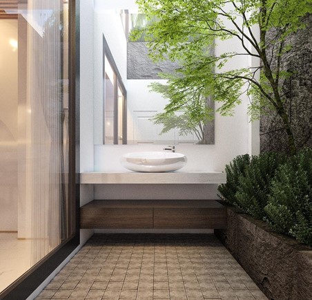 Từ góc nhìn tiếp theo, chúng ta có thể thấy không gian hiện lên theo nhiều vật dụng, vật liệu kết hợp cho các mục đích trang trí như đèn chiếu sáng, cây cảnh, kết cấu từ vách che, kết cấu tường và quan trọng hơn cả là sự phối hợp nhịp nhàng giữa các màu sắc với nhau để chúng trở nên hoàn thiện hơn. Đáp ứng cho cuộc sống hiện đại ngày nay mà các gia đình hiện đại vẫn luôn cần áp dụng cho chính công trình của mình.