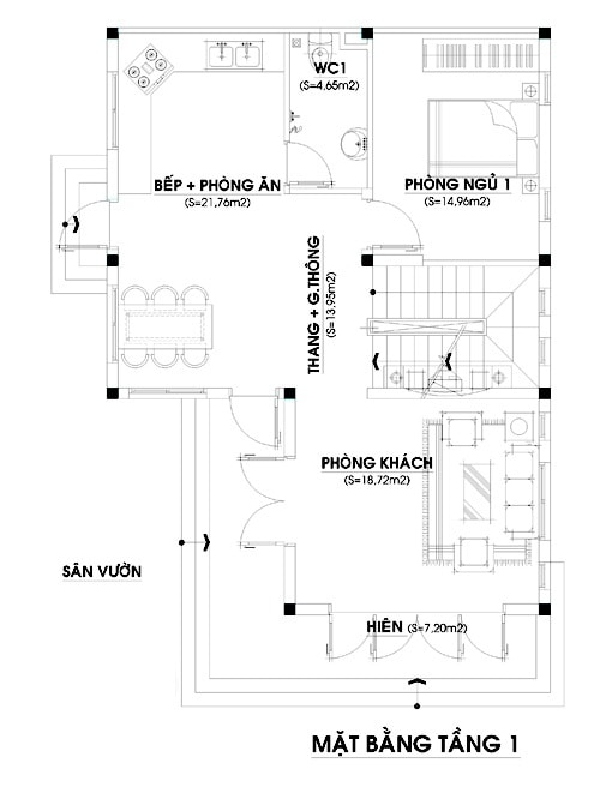 Bố trí không gian như bản thiết kế sẽ giúp gia chủ có một không gian phòng khách tương đối lớn, cùng với không gian bếp ăn và bàn ăn rất lớn, cách bố trí này khiến mặt bằng tầng 1 rộng rãi, thông thoáng, phù hợp với việc gia chủ tụ tập bạn bè, người thân cuối tuần.
