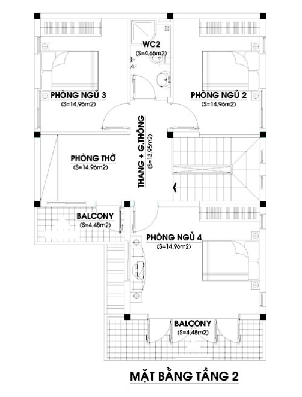 Với thiết kế tầng 2 bố trí 3 phòng ngủ với diện tích giống nhau đặt vào vị trí 3 góc nhà để tăng diện tích sử dụng cho cá nhân sử dụng căn phòng này, 1 phòng thờ và 1 nhà vệ sinh chung ở khu vực tầng hai. Không gian thờ đáp ứng đúng về mặt phong thủy Á Đông khi bố trí cửa lớn ra ban công.