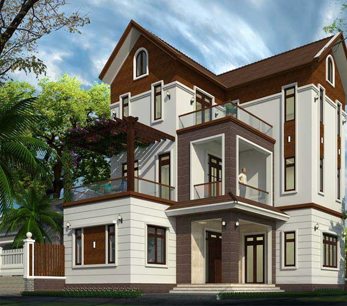 Mẫu biệt thự 2 tầng 1 tum có 5 phòng ngủ được thiết kế với gam màu trắng và nâu vừa hiện đại, lại mang nét đẹp cổ điển, sang trọng trên từng đường nét. Tập trung vào việc khắc họa những mảng lát cắt đơn giản, nhưng lại làm nổi bật nên sự mạch lạc, mới mẻ trong lối kiến trúc nhà ở. Phần đường khối, phào chỉ được thiết kế rất chuyên nghiệp, làm căn nhà không trở nên quá rườm rà mà còn mang lại không gian sống tiện nghi, thoải mái. Phía ban công được chia thành 2 khu vực, còn có cả thanh chắn phía trên để tiện che chắn và có thể tận dụng trồng cây cảnh, mang thiên nhiên vào trong căn nhà.