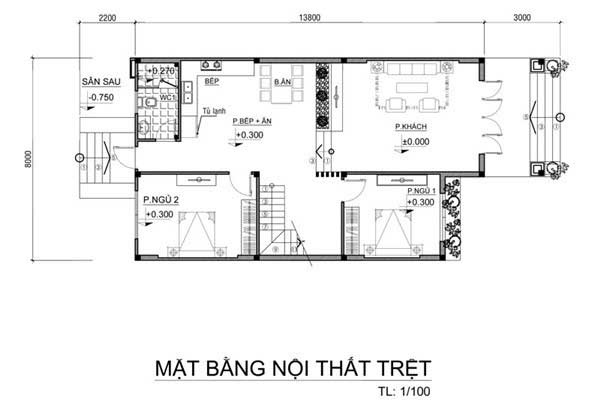 Tầng 1: phòng khách, phòng bếp + ăn, 2 phòng ngủ, toilet chung, sân sau.