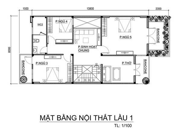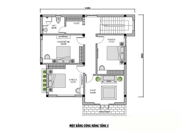 Tầng 2: phòng thờ, 3 phòng ngủ, 1 phòng sinh hoạt chung và ban công.