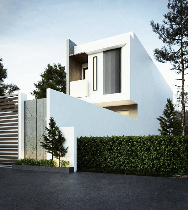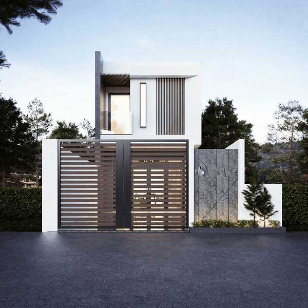 Mẫu này được thiết kế độ đáo khiến cho người xe phải thích thú với phong cách hiện đại mới lạ, đập tan sự mạnh mẽ, đường nét dứt khoát thay vào đó là những đường cong uyển chuyển của cánh cổng và tầng hai. Màu sơn chỉ sử dụng tone trắng mang lại vẻ thuần khuất cho ngồi nhà kết hợp với cánh của làm tô thêm vẻ sang trọng và lộng lẫy.