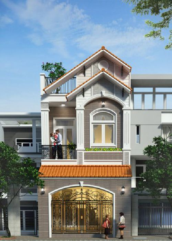 Không nằm ngoài top thiết kế đẹp cho mẫu nhà 2 tầng 8x13 là mẫu thiết kế theo phong cách tân cổ điển, lựa chọn kiến trúc Pháp cực kỳ sang trọng, cổ điển cho gia chủ sở hữu. Tone trắng trang nhã, lịch sự cho toàn bộ mặt tiền. Điểm nổi bật là cột trụ tròn được sử dụng linh họa từ để chồng lên nhau đến cột kép ở tầng hai, ban công sắt với hoa tiết cong cổ điển. Phần mái hình thang với kiến trúc giả mái mang đến kiến trúc điển hình nước Pháp đặt tại Việt Nam.