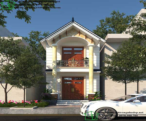 Không quá phô trương bằng những đường nét hoa văn sắc sảo. Với chi phí có hạn thì việc lựa chọn mẫu nhà ống 2 tầng mái bằng như trên là rất hợp lí. Phần hiên trước nhà bạn có thể trồng cây dây leo lên dàn tạo bóng mát để xe ô tô. Vừa không cần làm gara vừa mang đến vẻ đẹp thẩm mĩ, bóng mát cho ngôi nhà.