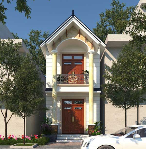 Lối kiến trúc cổ điển, lấy hơi hướng của những căn nhà thập niên 90 kiểu Pháp, cửa chính và cửa của tầng trên đều được xây dựng bằng chất liệu gỗ. 2 trụ chính bố trí phía trước nhà vừa tăng sự chắc chắc, kiên cố còn mang nét thẩm mỹ sang trọng, độc đáo. Đây cũng là mẫu nhà hot đang được các hộ gia đình ưa chuộng về những năm gần đây.
