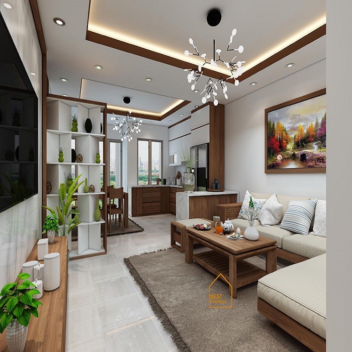 Không gian ngôi nhà thật sang trọng bởi sự kết hợp màu sắc rất tinh tế và hài hòa cho các nội thất. Với bộ bàn trà được thiết kế và thi công trên chất liệu gỗ tự nhiên đơn giản với màu nâu truyền thống của gỗ làm nổi bật nên không gian nhà trên nền gạch trắng vân hoa. Để không gian nhà thêm trong sạch thì bạn nên kết hợp một hai cây cảnh cây xanh trang trí bên cạnh kệ tivi như hình ảnh càng làm tăng thêm thẩm mỹ cho phòng khách.