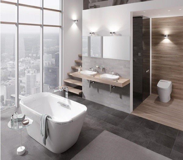 Còn đây là một lát cắt của nhà tắm khong khu vệ sinh khép kín của phòng ngủ tầng 2. Mặc dù diện tích khiêm tốn xong vẫn đáp ứng được đầy đủ tính năng sử dụng của một nhà tắm. Nội thất của nó luôn đảm bảo bền bỉ, đẹp đẽ bởi lớp tráng men cao cấp từ bồn tắm, bồn rửa tay đến cả những chiếc gương soi.