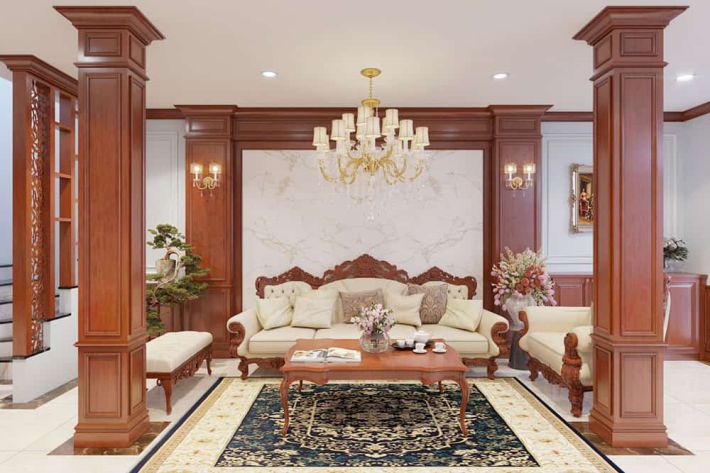 Phòng khách luôn là trung tâm của căn nhà bởi nó được coi là nơi sang trọng và lịch sự nhất để tiếp khách. Phòng khách mang kiến trúc Pháp thể hiện qua màu sắc được sử dụng là màu vàng nhạt, vàng nắng, nâu sô- cô- la, đỏ rực, xanh coban, màu gỉ sắt, … Những phụ kiện trang trí thêm màu xám xỉn và đen sáng sẽ làm nổi bật độ sáng cho những màu trên.