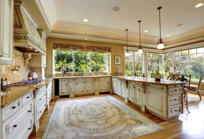 Phòng bếp được thiết kế qua kiến trúc kiểu Pháp được thể hiện qua mẫu tủ bếp chữ L hoặc chữ U được làm bằng chất liệu gỗ cao cấp phù hợp với không gian phòng bếp kiểu Pháp. Không gian phòng bếp sẽ vừa nấu ăn vừa làm phòng ăn được sơn màu trắng chủ đạo và bộ bàn ghế ăn, tủ bếp được chạm khắc tỉ mỉ. Điều này vừa tạo cho không gian nhà bếp vừa ấm cúng vừa sang trọng.