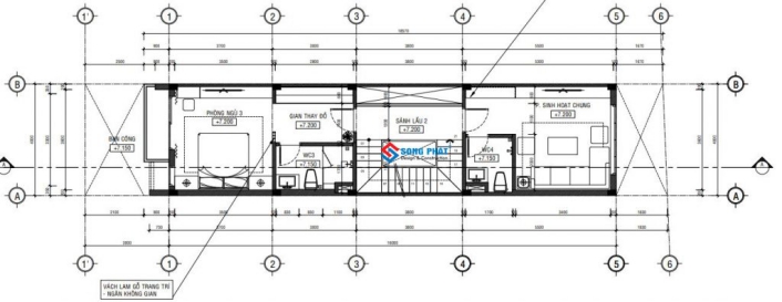 Phòng khách được thiết kế ngay giữa trung tâm thẳng lối cầu thang đi lên không cần ngăn cách với cửa để “ăn gian” diện tích cho căn phòng. Hai phòng ngủ được ngăn cách bởi phòng khách ở giữa. Tại phòng khách có một ban công nhỏ để trồng cây tạo không gian xanh cho ngôi nhà.